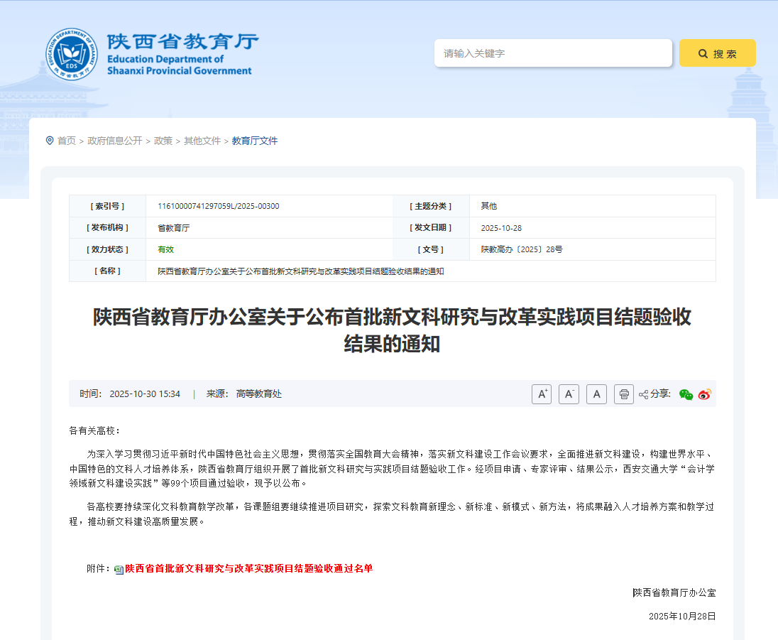 近日,陕西省教育厅《陕西省教育厅办公室关于公布首批新文科研究与改革实践项目结题验收结果的通知》(陕教高办〔2025〕28号),我校“多学科交融的国家安全法学专业建设探索与实践”“法治学教学体系创新实践研究”“西部地区卓越涉外法治人才培养创新与实践”“卓越新闻传播人才政产学研协同育人机制创新与实践”“法商相融复合型卓越经管人才培养体系的创新与实践”“新文科教师实践能力提升机制研究”等6个新文科研究与改革实践项目已完成建设任务,顺利结项,标志着学校在新文科专业建设领域的改革实践取得阶段性重要成果。