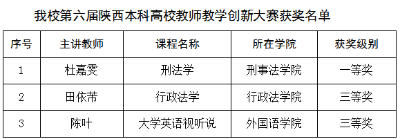 近日,由陕西省教育厅主办、西北工业大学承办的第六届陕西本科高校教师教学创新大赛落下帷幕。经过层层筛选和激烈角逐,我校刑事法学院杜嘉雯教师团队荣获一等奖,行政法学院田依芾教师团队、外国语学院陈叶教师团队荣获三等奖。