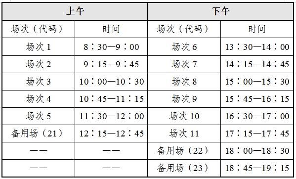 英语四级口语考试(CET—SET4)考试时间为 11 月 22日(F253次),英语六级口语考试(CET—SET6)考试时间为 11 月 23 日(S254次),具体场次安排如下: