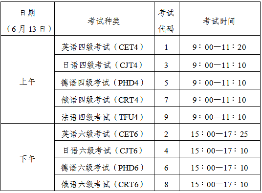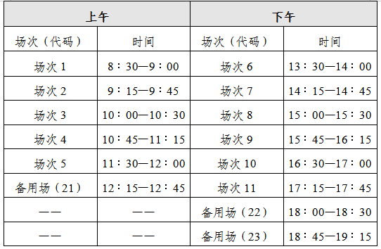 英语四级口语考试(CET—SET4)考试时间为5月23日(F261次),英语六级口语考试(CET—SET6)考试时间为5月24日(S262次),具体场次安排如下: